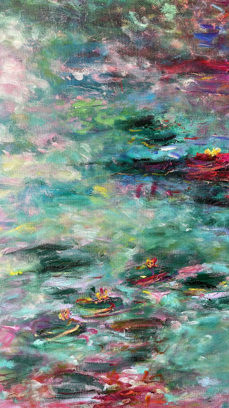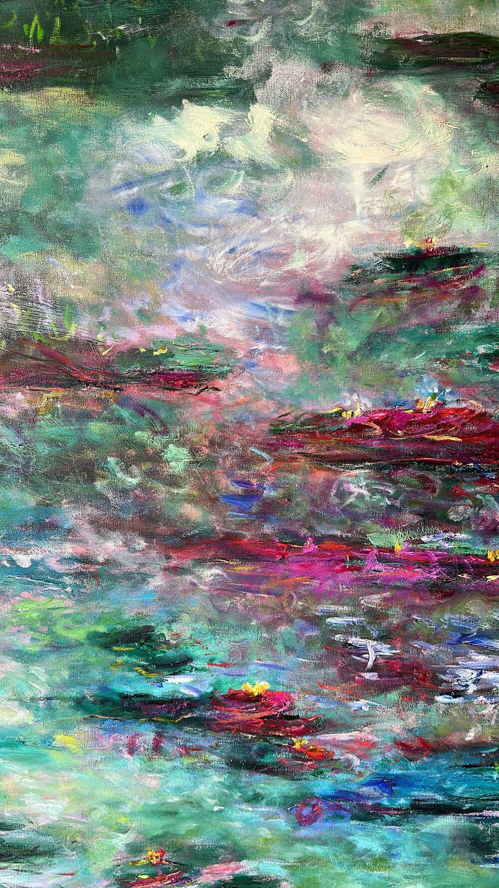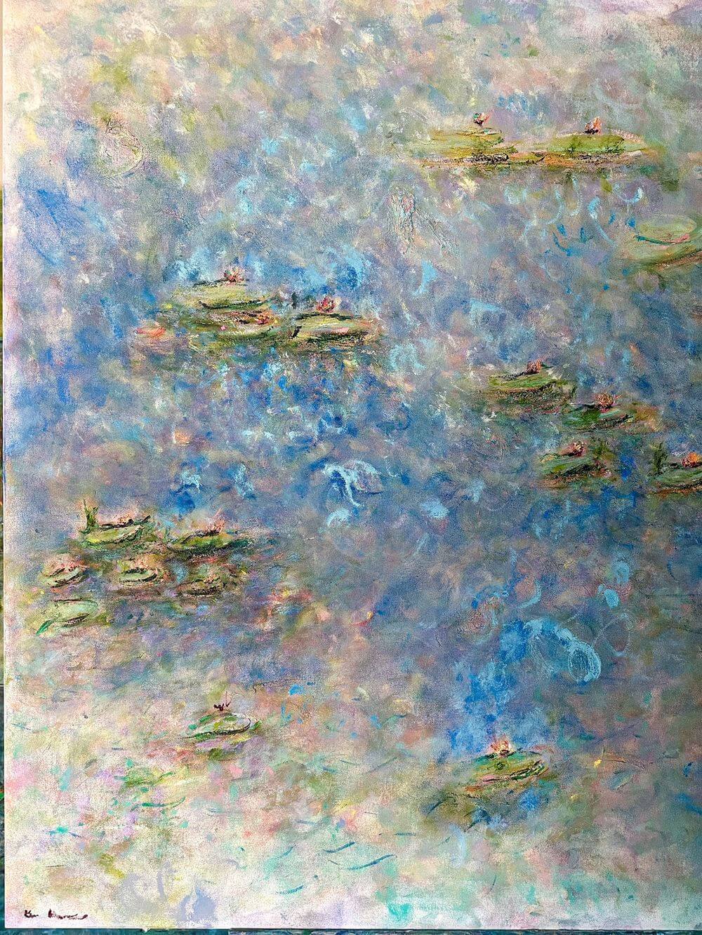 Kim Ahonoukoun has made waterlilies her main subject. Her fascination with these delicate and timeless symbols of nature speaks to her deep connection to the Impressionist tradition. Waterlilies, with their serene beauty and reflective surfaces, allow her to explore the nuances of light, texture, and the transient qualities of nature, much in the same way Monet did in his iconic series. Out of more than 80 waterlily paintings created to date, 65 are now part of private collections worldwide, demonstrating the universal appeal of this vision.With tranquil tones and immersive compositions, the paintings invite viewers into a space where art and nature meet. In the dark blue waters, blooms seem to float between reality and dream. The work celebrates resilience, serenity and the timeless beauty of the natural world, offering a fresh homage to Monet while speaking directly to today’s audience.